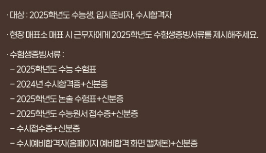 - 할인 대상: 2025학년도 수능 수험생, 검정고시 합격자, 각종 대학 입시 전형 참가자