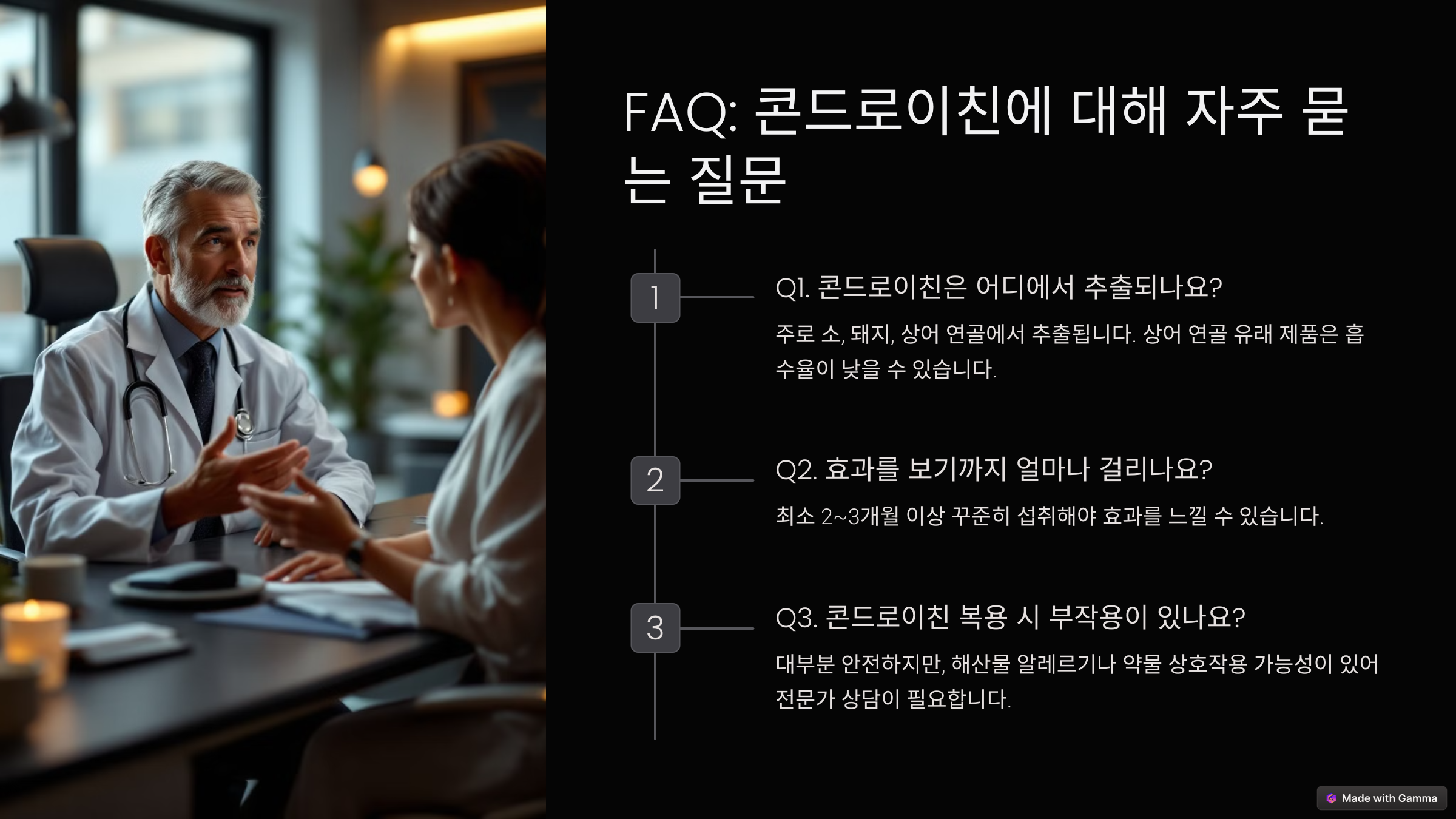 A. 주로 소, 돼지, 상어 연골에서 추출됩니다. 상어 연골 유래 제품은 흡수율이 낮을 수 있으므로 주의가 필요합니다.