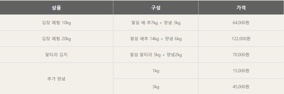 - 김장 체험 10kg: 절임 배추 7kg + 양념 3kg = 64,000원